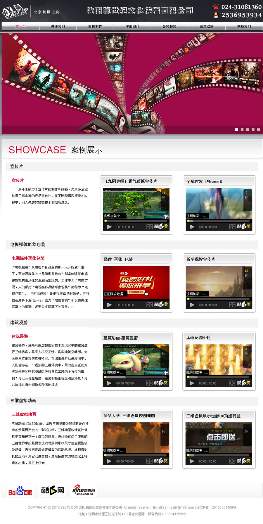 沈阳嬴世纪文化传播有限公司专业从事企业宣传片、专题片、形象宣传片、企业MV、爱情微电影、 企业年会、电视广告、产品广告、影视广告、电视直销片、电视频道包装、虚拟现实、角色动画、全息投影、多媒体、广告发布以及会务服务等。能够实现从调研、文案、策划、设计、影视、发布提供全程服务。是中国最活跃、最专业、最具经验与执行力的三维数字视觉展示服务提供商。拥有完善的数字视觉展示服务体系和庞大行业影响力。